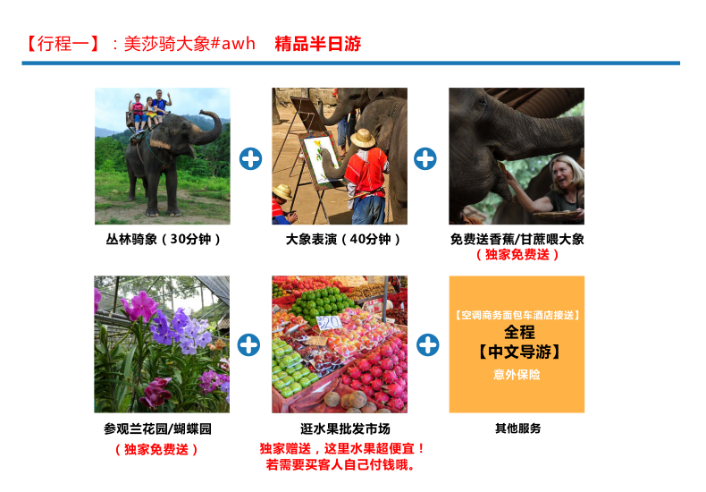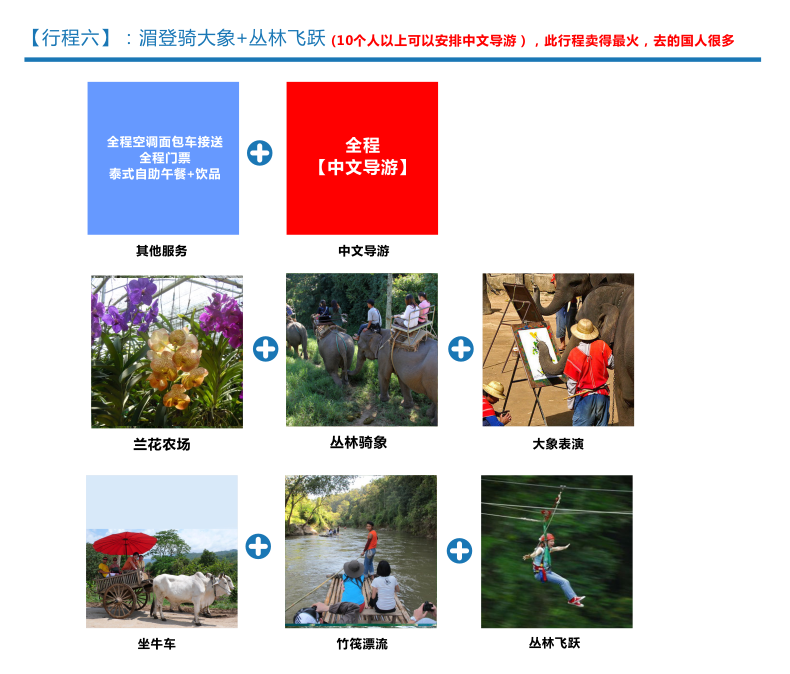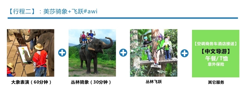【费用包括】:空调商务车酒店接送、中文导游、大象表演、骑大象、飞跃、午餐(在丛林飞鼠飞跃吃)、T恤、意外保险。