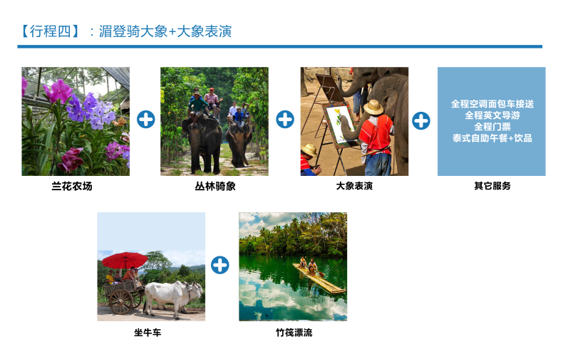 【费用包括】:1. 全程空调面包车接送;2. 泰式自助午餐+饮料;3. 全程英文导游;4. 全程门票;5. 娱乐项目:兰花农场、骑大象、大象表演、坐牛车、竹筏漂流,或 加长颈族门票。